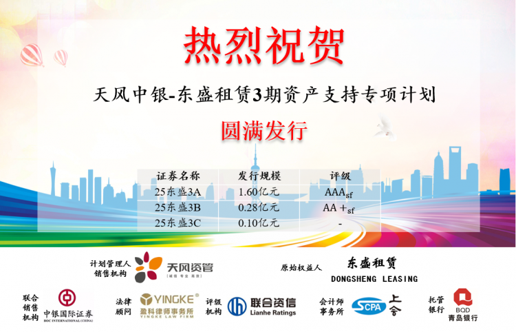 熱烈祝賀天風中銀-東盛租賃第3期資產(chǎn)支持專項計劃圓滿發(fā)行