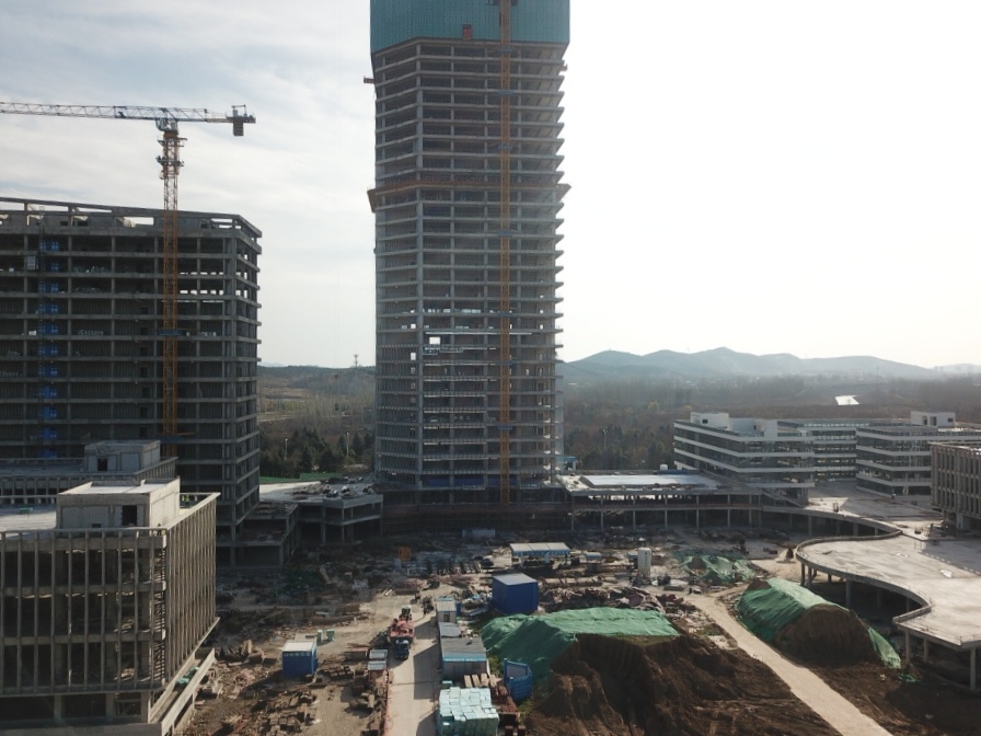 淮北第一高樓——商務政務中心采用框架核心筒結構,建筑面積超7萬平方米,設計復雜、施工難度大,地下室出正負零后以平均7天一層的速度向上生長,工程部副部長張玉坤駐點管理,項目在做到質量、安全雙優(yōu)的同時,以不到一年的時間實現(xiàn)封頂,刷新淮北速度。項目不僅提前完成了年度節(jié)點目標,而且先后獲得2020年“安徽省建筑安全生產(chǎn)標準化工地”、“全國AAA安全文明標準化工地項目”的省級、國家級榮譽,在全市范圍內先后召開了兩次市住建局主辦的建筑質量安全現(xiàn)場觀摩會,下一步將爭創(chuàng)“黃山杯”及“國優(yōu)”工程,做到進度、質量兩不誤。目前南區(qū)各主樓結構已全部封頂,二次結構、安裝工程完成70%,即將進入幕墻和裝飾裝修穿插施工階段。