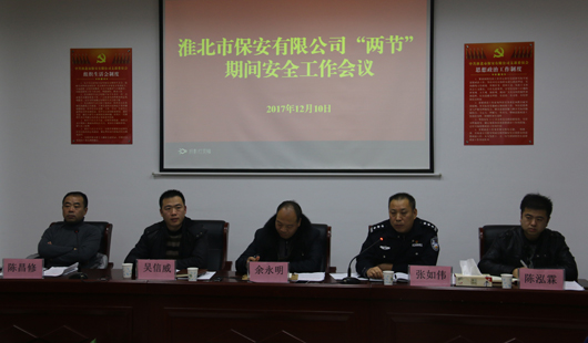 2017年12月10日晚,淮北市保安有限公司在六樓會議室召開“兩節(jié)”期間安全工作會議和講服務(wù)、轉(zhuǎn)作風專項整頓活動啟動儀式,公司領(lǐng)導(dǎo)班子成員及市監(jiān)管支隊政委張如偉同志出席會議。