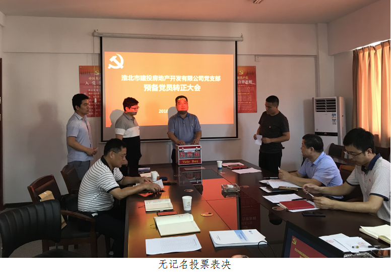2018年7月13日下午,建投房地產(chǎn)公司黨支部在黨員活動室召開了預(yù)備黨員轉(zhuǎn)正大會,研究討論公司支部預(yù)備黨員王申瑞轉(zhuǎn)正問題。